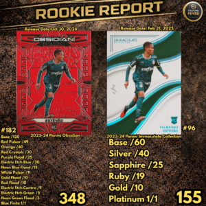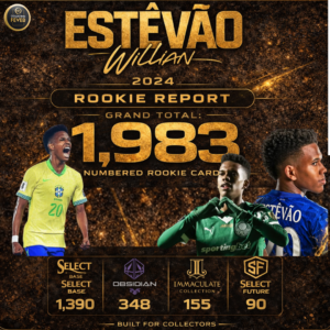 The set includes a deeper parallel ladder and several unique finishes that add additional layers of rarity to Estêvão’s rookie catalog.